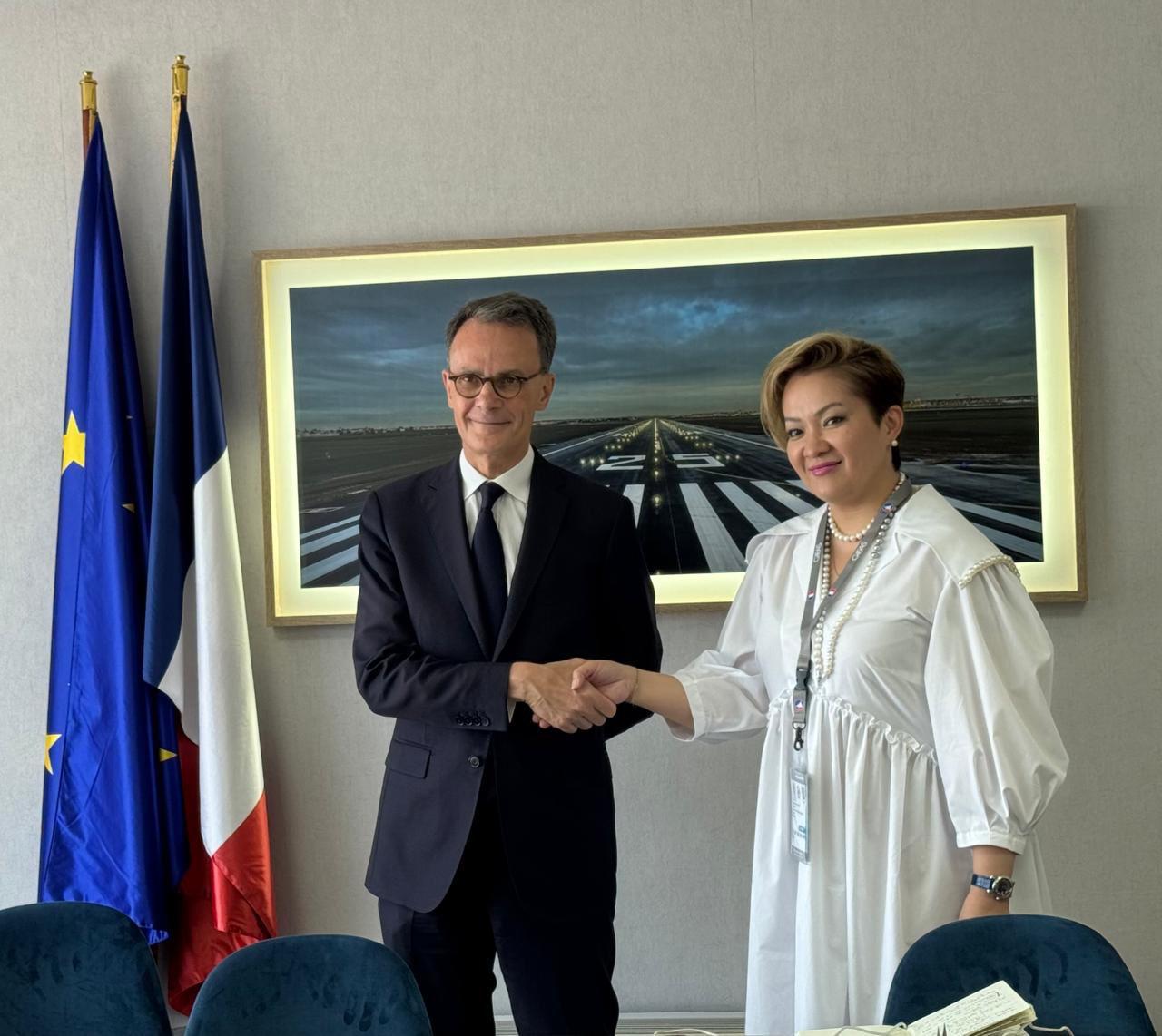 On the sidelines of the ICAO EUR/NAT-DGCA/2025 Directors General Meeting, Saltanat Tompiyeva, Chair of the Civil Aviation Committee of the Ministry of Transport of the Republic of Kazakhstan, and Damien Cazé, Director General of the French Directorate General for Civil Aviation (DGAC), signed a Cooperation Agreement in the Field of Civil Aviation between the Civil Aviation Committee of Kazakhstan and the Ministry of Urban and Rural Planning and Decentralization of the French Republic.