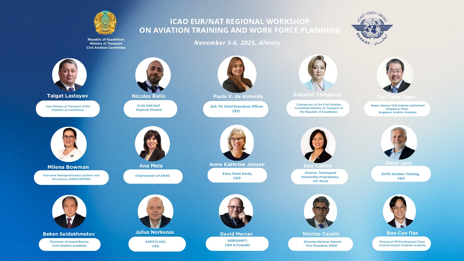 В числе спикеров директор Европейского центра передового опыта JAA TO Паула В. де Алмейда, исполнительный менеджер по воздушному пространству и системам Eurocontrol Милена Боуман, генеральный директор GATE Aviation Training Дирх Янс, вице-президент ENAC Николя Казалис, директор программ обучения и партнерства ACI World Исса Кастро, декан Сингапурской авиационной академии Тай Тианг Гуан, директор отдела развития персонала Авиационной академии аэропорта Инчхон Вон Сун Пак, основатель AeroShift Дэвид Мерсер и другие.